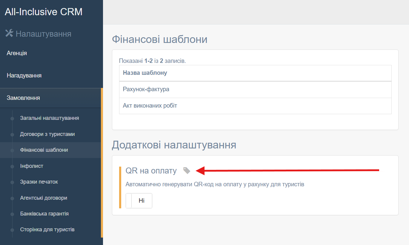 Активувати QR на оплату можна у налаштуваннях фінансових шаблонів: