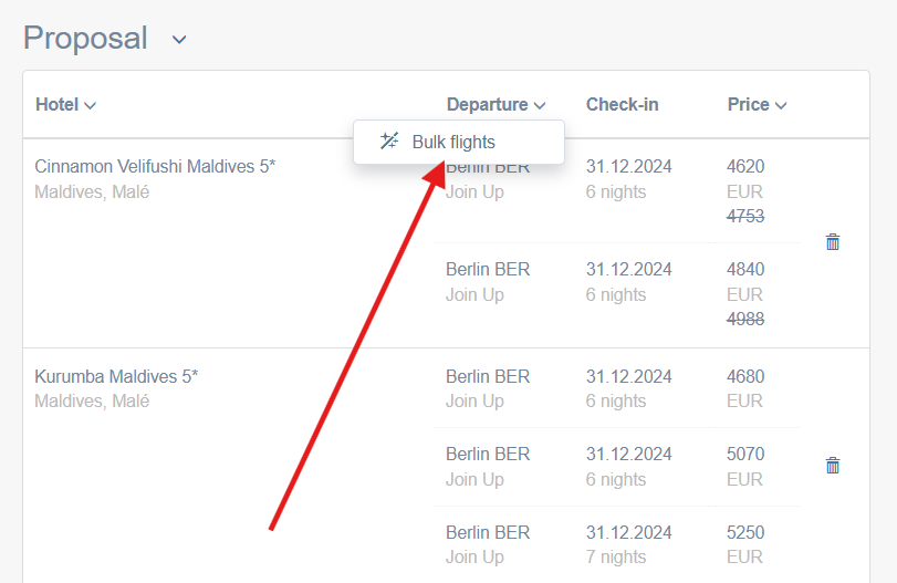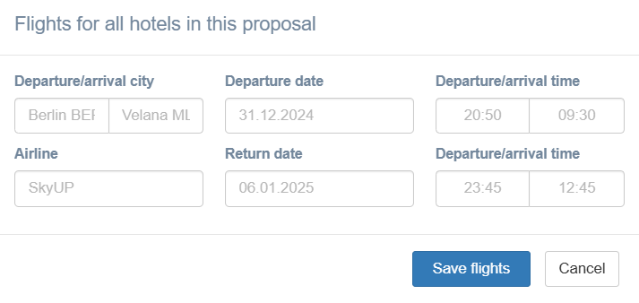 Now you can specify the flight for all hotels in the proposal at once: